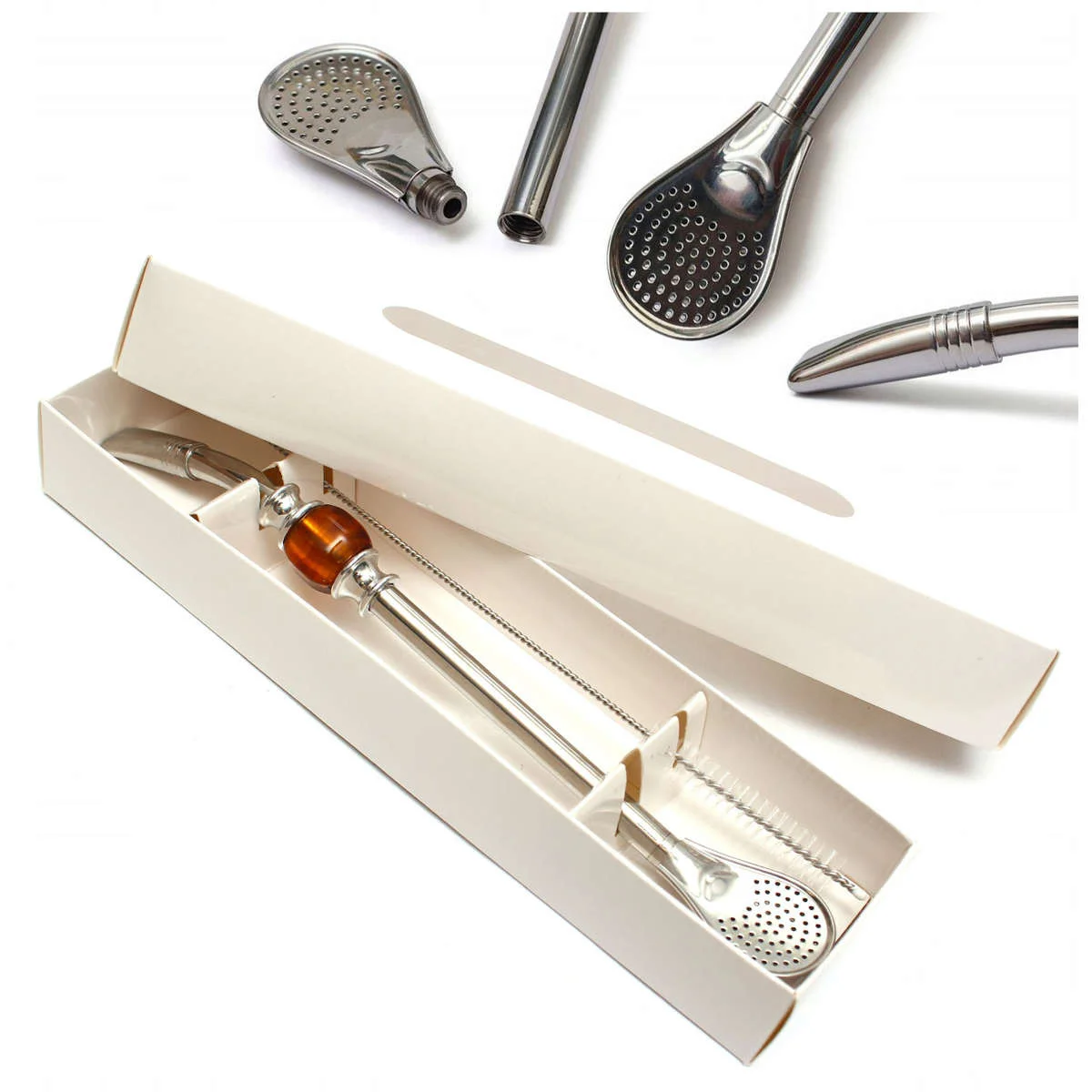 Produkt, który będzie służył przez wiele lat, cieszył użytkownika praktycznością i starannym wykonaniem. Jak większość bombilli ze stali INOX, posiada klasyczny system łyżeczkowy oparty na brazylijskim systemie Liza, który pierwotnie był przygotowany do naparu typu Chimarrao, czyli mocno sproszkowanej yerba mate. Łyżeczka jest solidna, a bombilla nie podatna na wgniecenia czy zmiany kształtu. Świetnie filtruje każdy rodzaj yerby mate, dzięki swojemu precyzyjnemu filtrowi. Upora się również z drobinkami suszu, pyłu i zmielonymi patyczkami. Końcówka jest rozkręcana i prosta w czyszczeniu. Jest to wygodne rozwiązanie, bardzo łatwe w codziennym użytkowaniu i pielęgnacji. Bombille charakteryzuje mocno wypolerowany ustnik, ozdobiony prostymi żłobieniami. Składa się również z dwóch pierścieni chłodzących, które pomagają w ostudzeniu napoju, dzięki odbieraniu ciepła z cieczy płynącej przez rurkę. Bombille zdobi szaro-zielony kamień umocowany między pierścieniami. Bombilla jest długa - 22 cm, w zestawie z wygodną szczoteczką o długości 21 cm. Całość zapakowane jest w estetyczne tekturowe pudełko z wkładką. Gotowe na prezent.